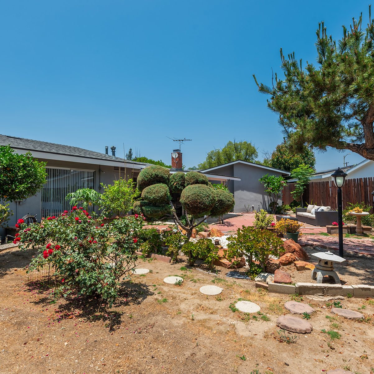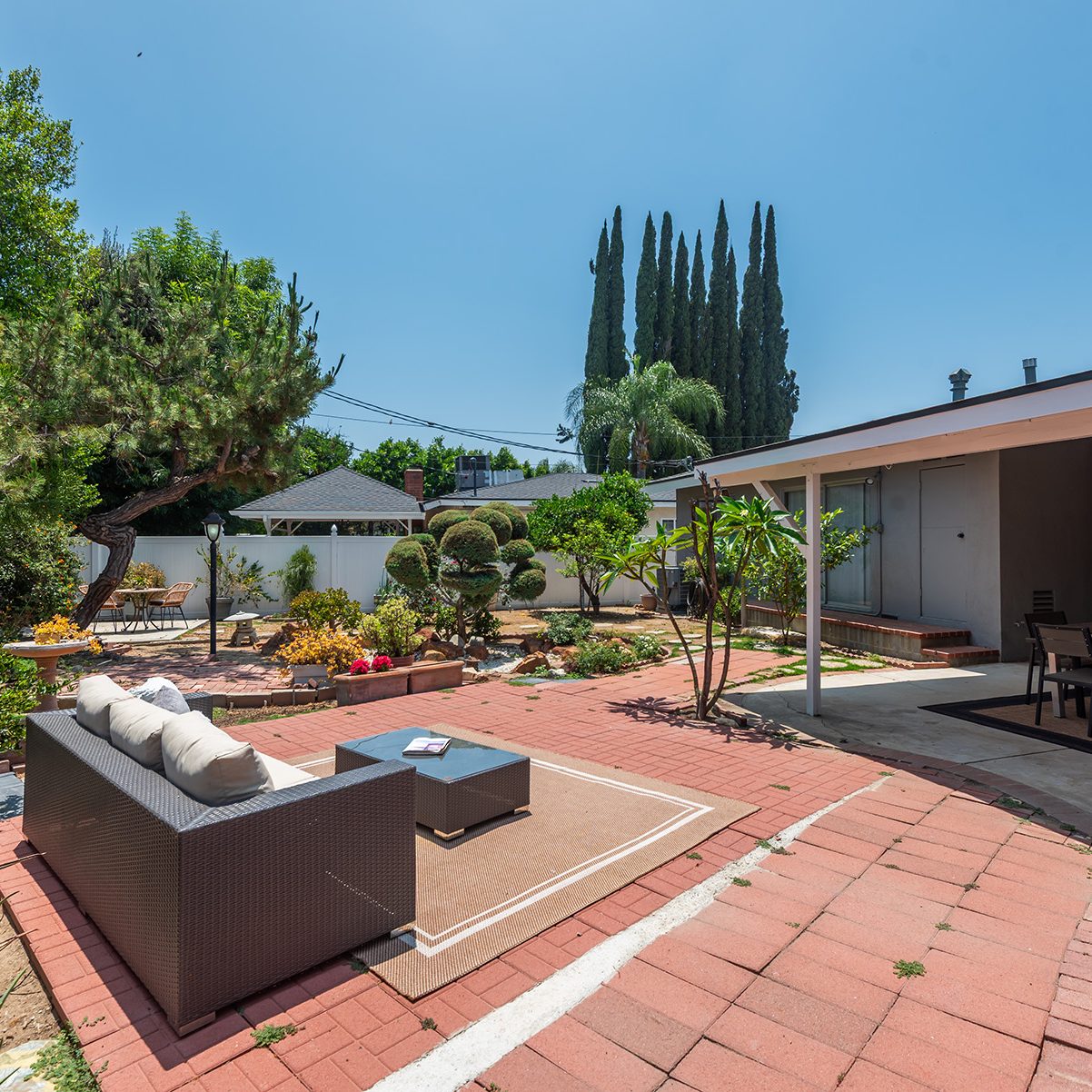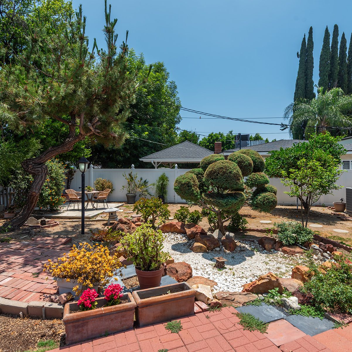 Sliding doors from the living area extend the living space to the outdoor patio, making it ideal for seamless indoor-outdoor entertaining. The expansive backyard is a true haven with a diverse array of mature trees, including delicious orange, lemon, guava, and Asian apple varieties. A shaded patio cover provides the perfect setting for al fresco dining. Multiple sitting areas throughout the yard encourage creative use of the large outdoor space.