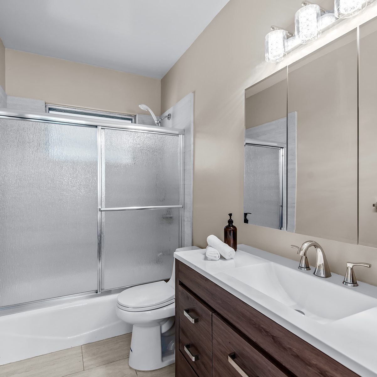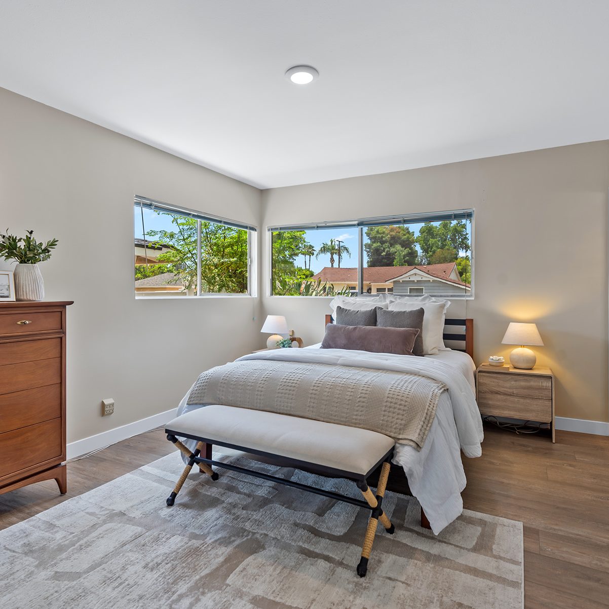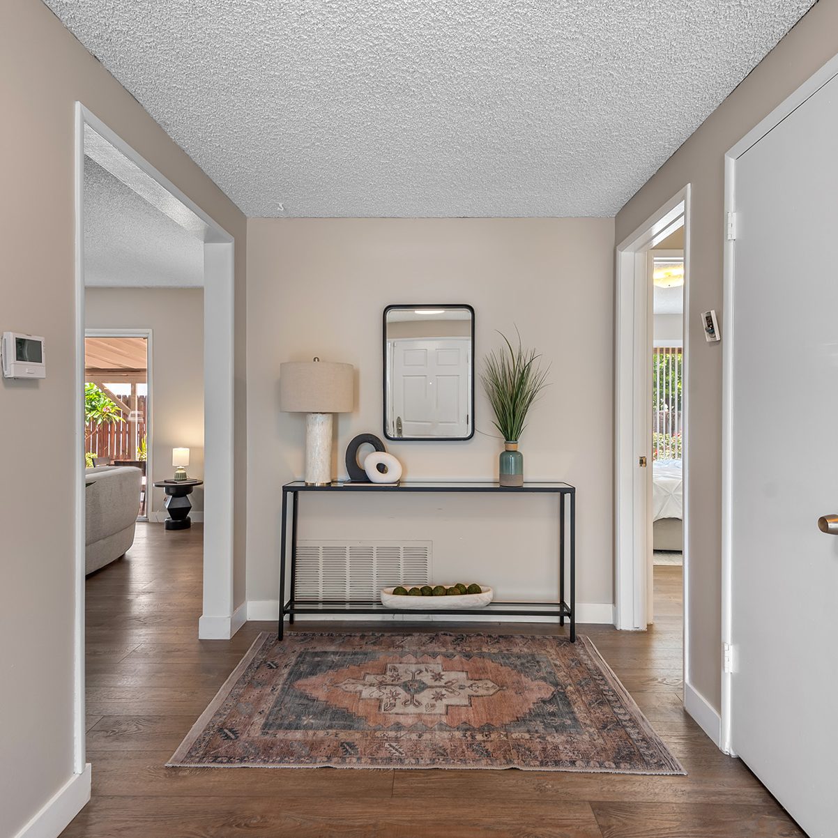 A welcoming foyer sets the tone for the rest of the home. The thoughtfully laid-out floor plan separates the main living areas from the private bedroom quarters, ensuring a sense of peace and tranquility. The heart of the home is the oversized living room where a charming fireplace creates a focal point. The open floor plan connects the dining area and the kitchen which is equipped with stainless steel appliances, ample cabinet space, and a breakfast bar. The main bedroom serves as a private retreat, complete with an en-suite full bathroom and a relaxing bathtub. The guest bedroom is flooded with natural light and provides direct access to the backyard, along with a large walk-in closet. An additional guest bedroom could be a perfect home office. The spacious shared bathroom has been updated with elegant tiles and a glass shower.