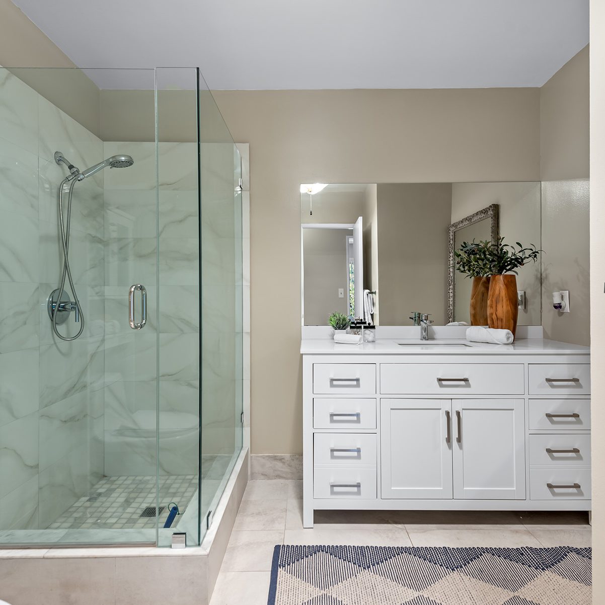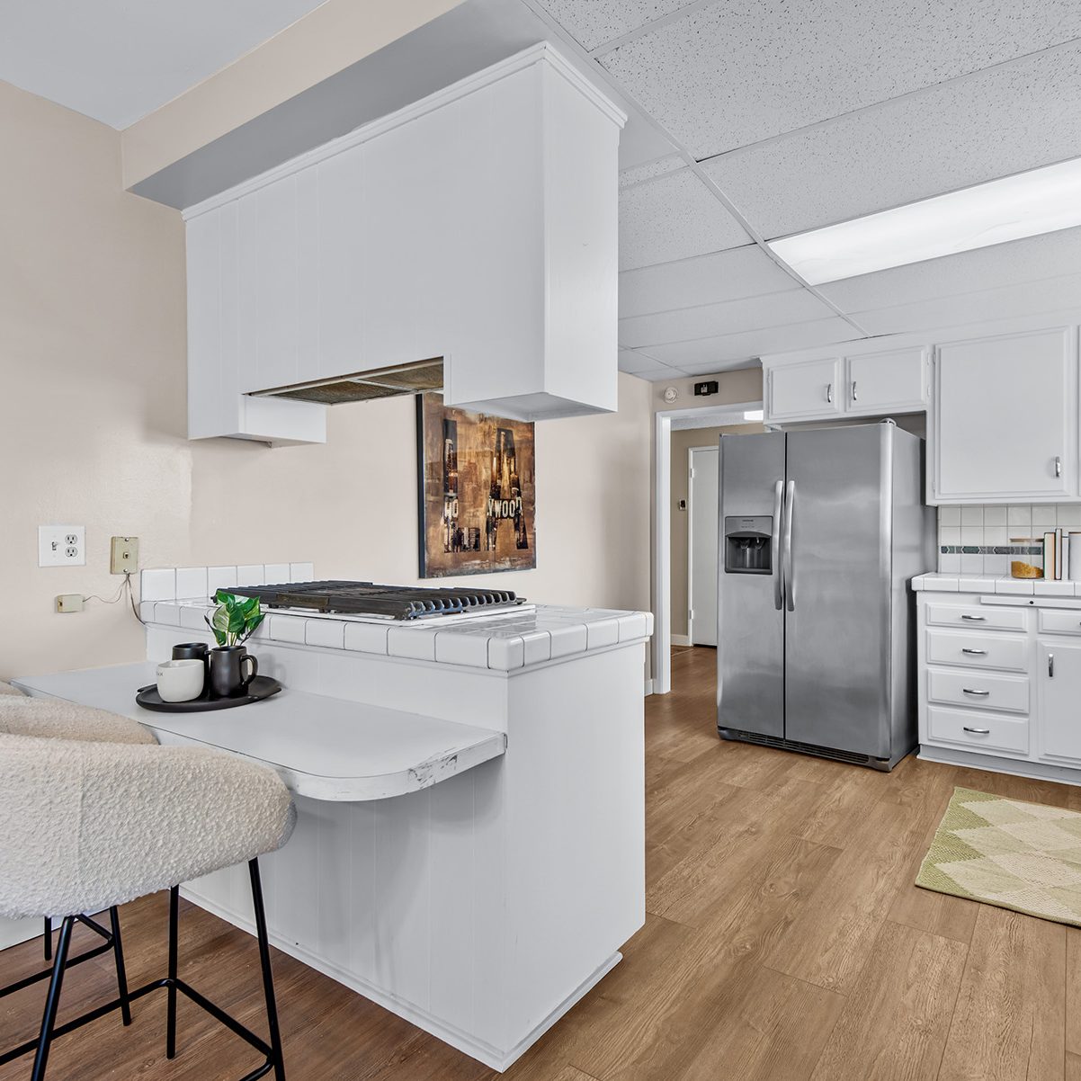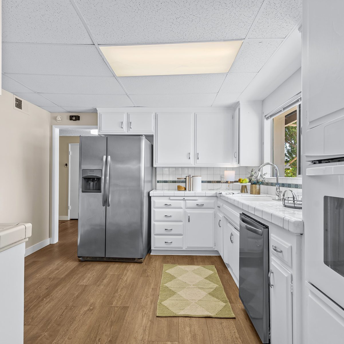 A welcoming foyer sets the tone for the rest of the home. The thoughtfully laid-out floor plan separates the main living areas from the private bedroom quarters, ensuring a sense of peace and tranquility. The heart of the home is the oversized living room where a charming fireplace creates a focal point. The open floor plan connects the dining area and the kitchen which is equipped with stainless steel appliances, ample cabinet space, and a breakfast bar. The main bedroom serves as a private retreat, complete with an en-suite full bathroom and a relaxing bathtub. The guest bedroom is flooded with natural light and provides direct access to the backyard, along with a large walk-in closet. An additional guest bedroom could be a perfect home office. The spacious shared bathroom has been updated with elegant tiles and a glass shower.