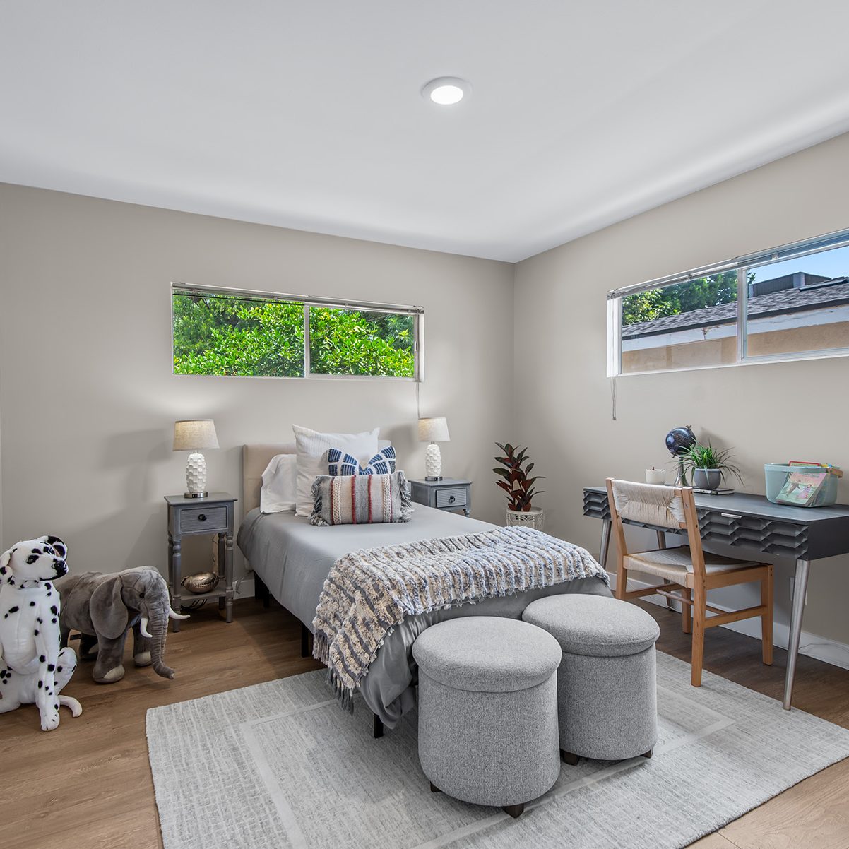 A two-car garage with a wide driveway offers ample parking and storage. Enjoy easy access to a variety of shops and restaurants including Porto’s Bakery, all just moments away.
